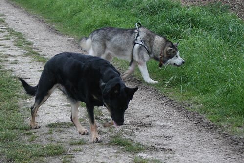 Dass der Maxe nur mit Vorsicht von der Leine gelassen werden kann, war anfangs noch nicht abzusehen. Da trottete er brav neben uns her und wenn er sich einmal etwas weiter entfernte, schaute er von selbst danach, uns bloß nicht zu verlieren. Nach fünf oder sechs Wochen jedoch, als er sowohl uns als auch die Umgebung einschätzen konnte, unternahm er die ersten Alleingänge. Er lief nicht wirklich fort, war aber auch nicht abrufbar und scherte sich einen feuchten Kehrricht darum, schrien wir nach ihm, egal in welchem Tonfall. Und da westlich die vielbefahrene Bundesstraße liegt und östlich der Wald mit seinen vielen Förstern, Jägern und Hochstühlen, machte uns die Unzuverlässigkeit des Hundes großes Kopfzerbrechen, dennn nicht einmal das Sichentfernen von unserer Hündin, welche zu 99,9 % zuverlässig abzurufen ist, störte den Malamuten auf Entdeckungsreise.